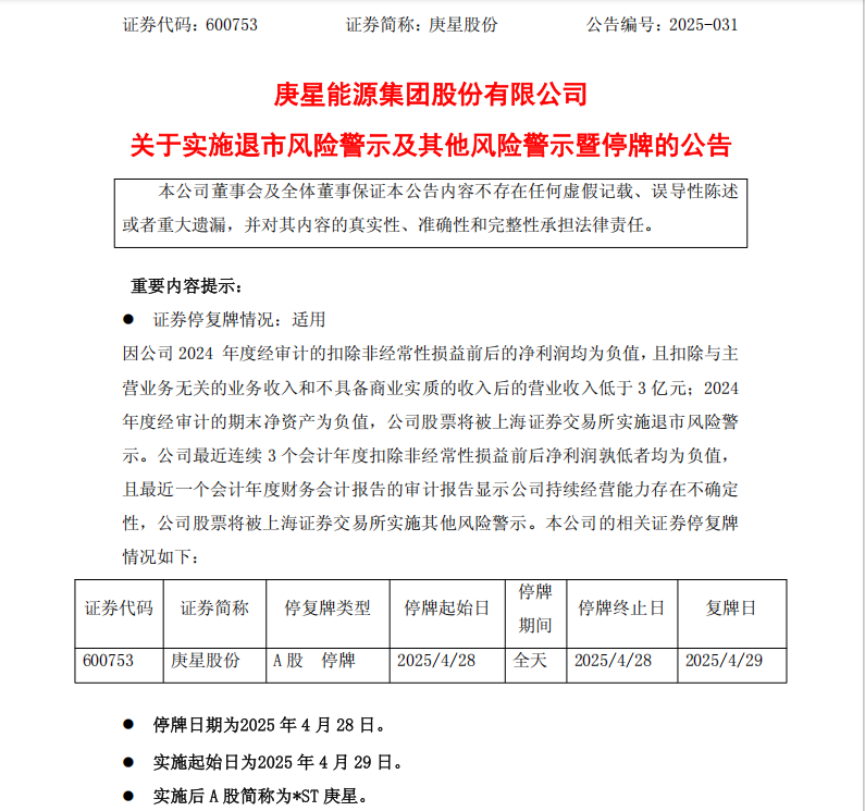 公告显示,庚星股份将被实施退市风险警示,主要是2024年利润总额、净利润或扣非后净利润均为负值,并且营业收入低于3亿元,以及经审计的2024年末净资产为负值。