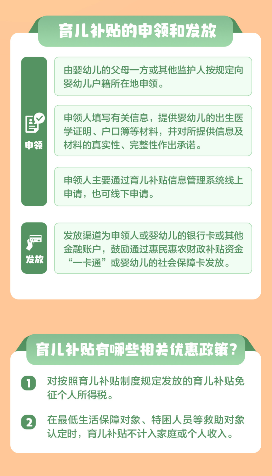 育儿补贴申领以家庭为单位,由申领家庭确定1名申领人,应当是婴幼儿父母一方,特殊情况下也可以是其他监护人。相关部门将指导各地结合孕产妇保健、住院分娩和婴幼儿预防接种、健康管理、户籍登记、社会保障卡申领等,做好政策宣传解读,提高政策知晓率,确保所有符合条件的婴幼儿应享尽享育儿补贴。